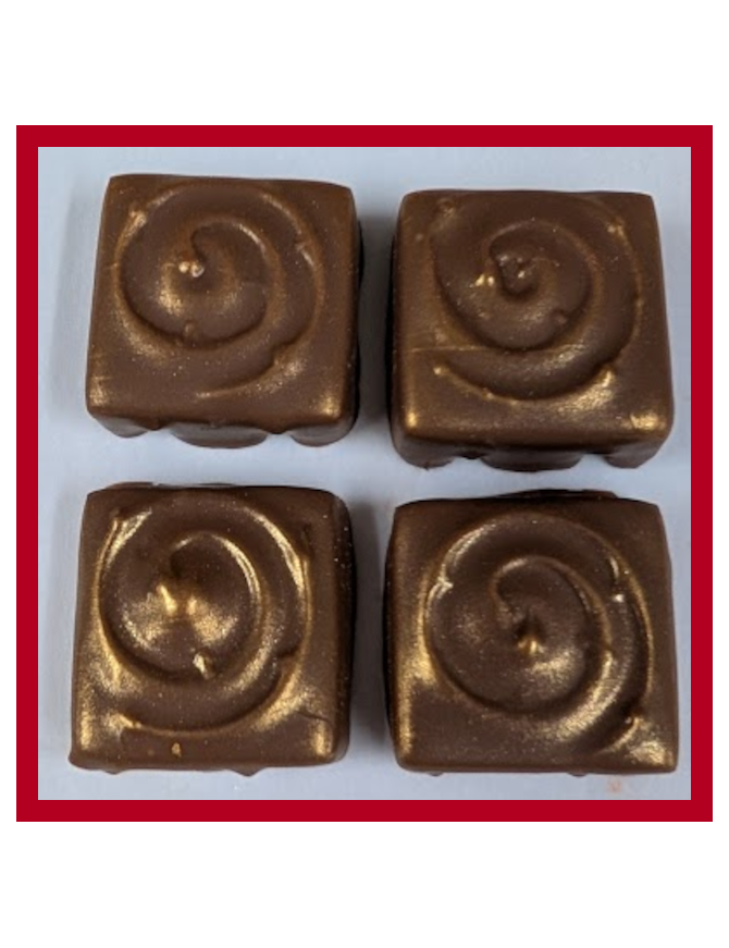 Milk chocolate, butter, heavy cream, butter vanilla aroma, and lightly colored with luster dust.