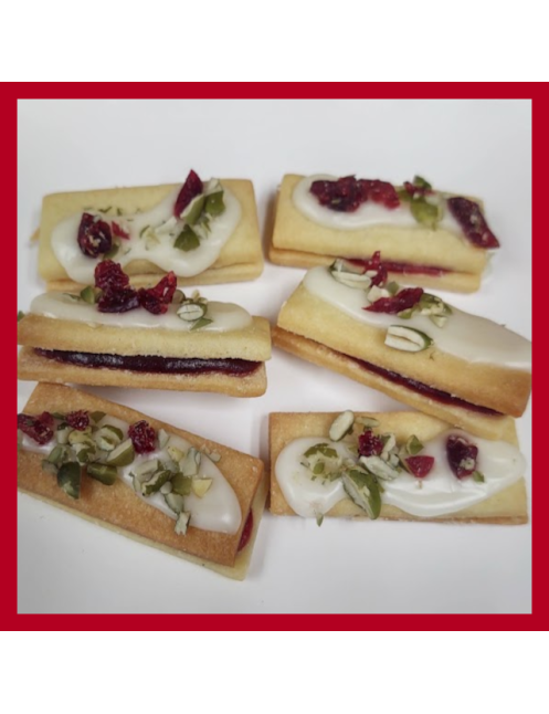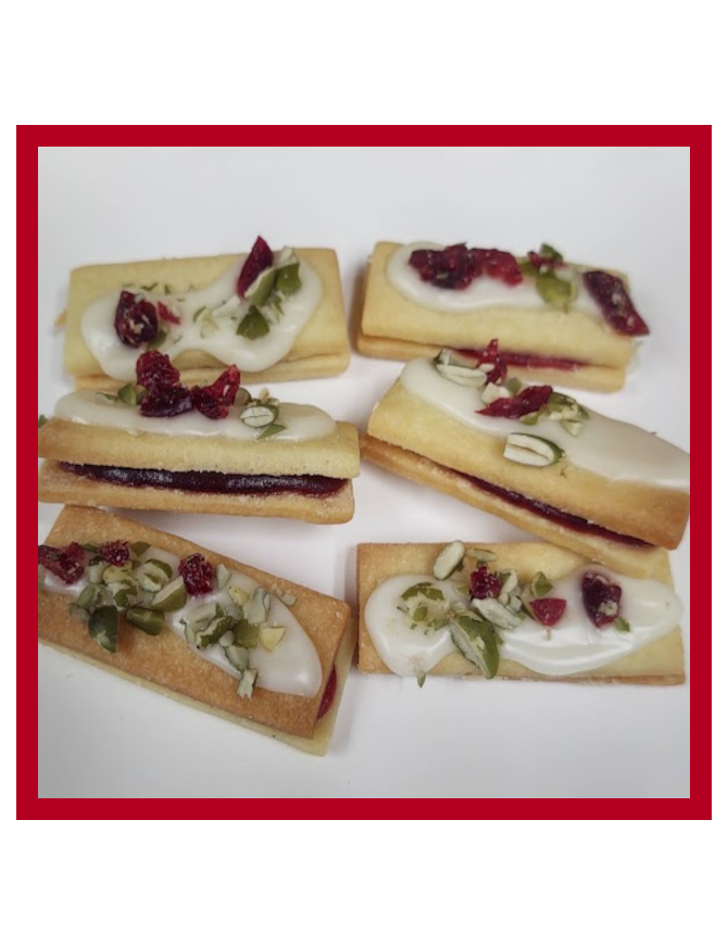 2 Orange cookies, filled with cranberry puree, topped with orange glaze, pepitas and dried cranberries.